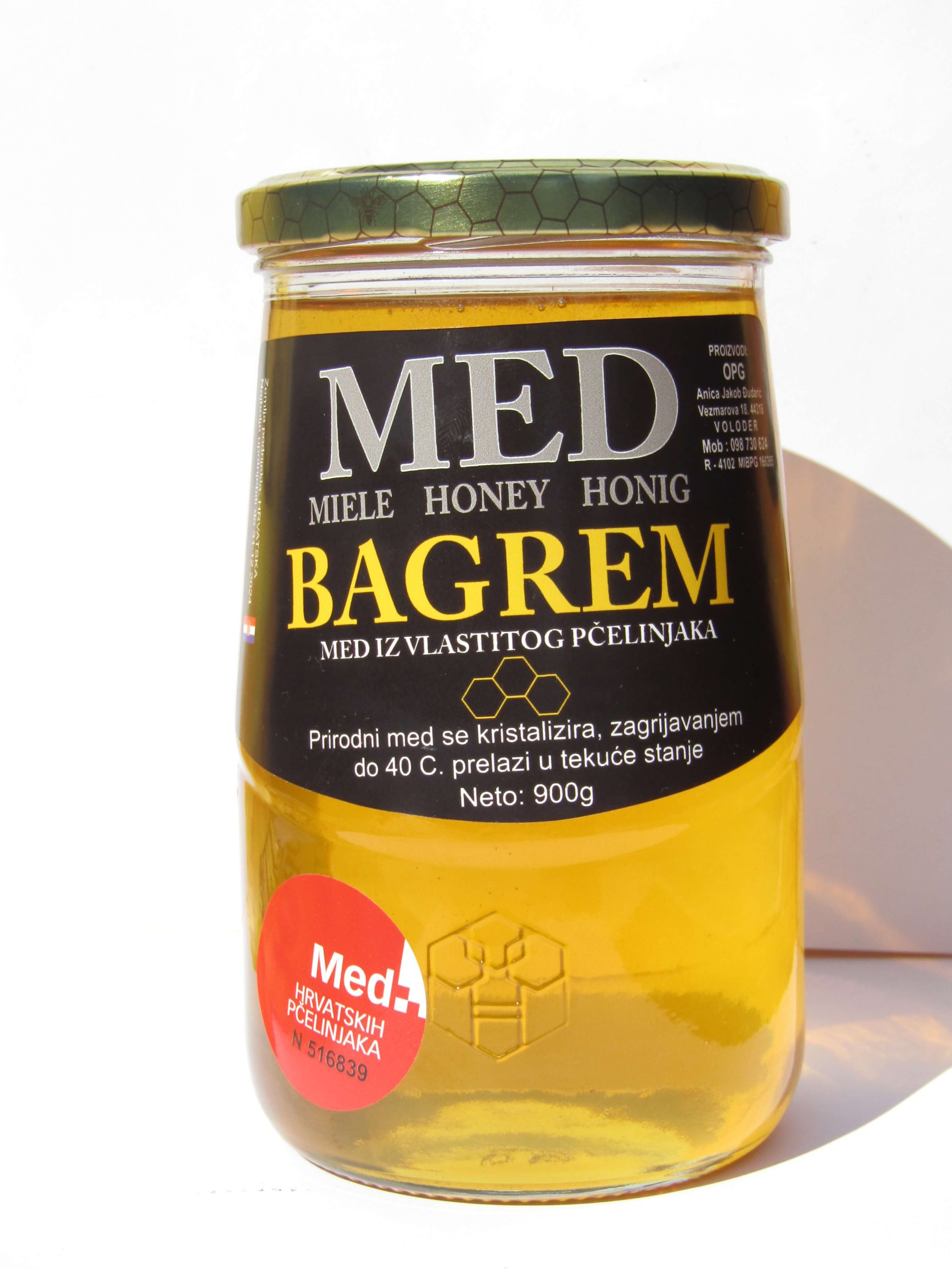 Med bagrem izuzetno je lagan i ukusan, izrazito svijetle boje i blagog mirisa. Zbog svojih karakteristika ubraja se u najcjenjenije vrste meda. U svom sastavu sadrži više fruktoze od glukoze, stoga se sporo kristalizira i mjesecima ostaje u tekućem stanju. Smatra se da smiruje živčani sustav, posebno kod nesanice, neuroze i vrtoglavice. Pomaže kod tegoba dišnih organa.